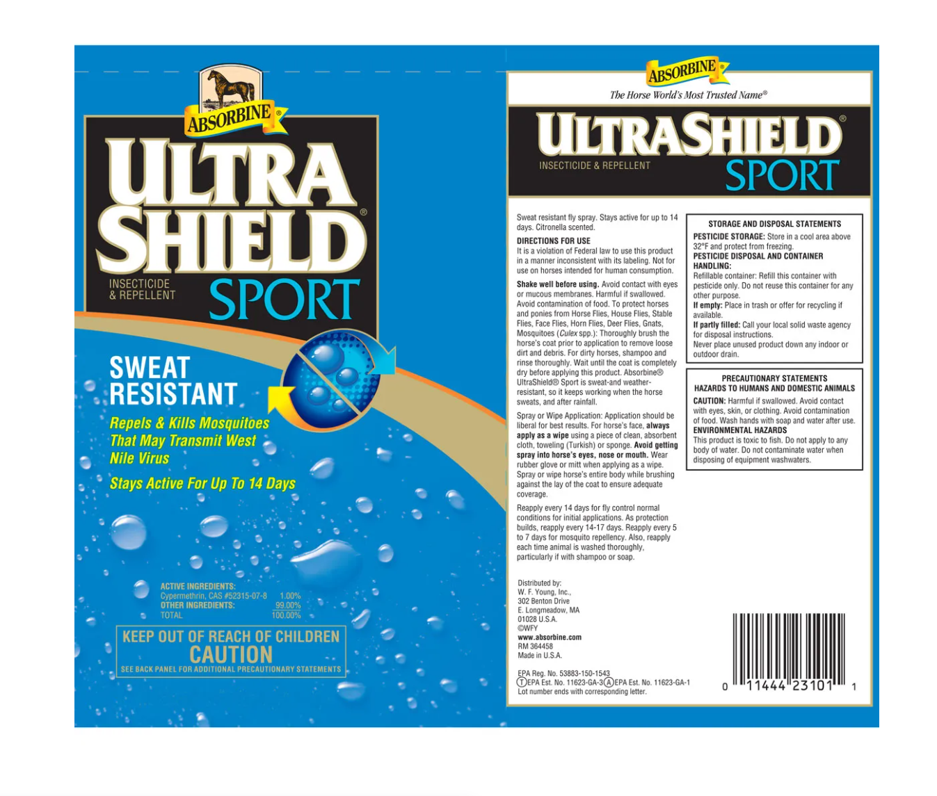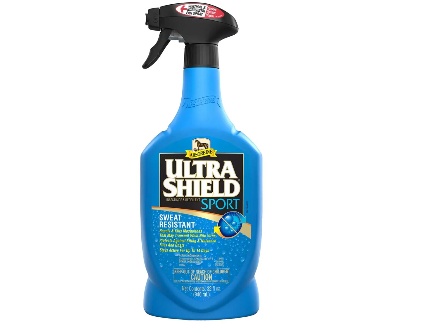 Absorbine Ultrashield Sport Fly Spray 32 oz is a powerful, sweat-resistant fly spray designed for horses in heavy workouts and hot, humid conditions. This long-lasting formula repels and kills more than 70 species of flies, mosquitoes, ticks, and gnats while providing up to 14 days of protection. The water-based formula leaves an oil-free shine without attracting dust, and its citronella scent enhances the application experience. Ideal for equine athletes, Ultrashield Sport ensures lasting insect control even after rain or intense exercise.
