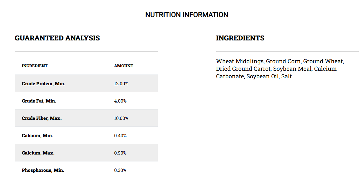 Wheat Middlings, Ground Corn, Ground Wheat, Dried Ground Carrot, Soybean Meal, Calcium Carbonate, Soybean Oil, Salt.