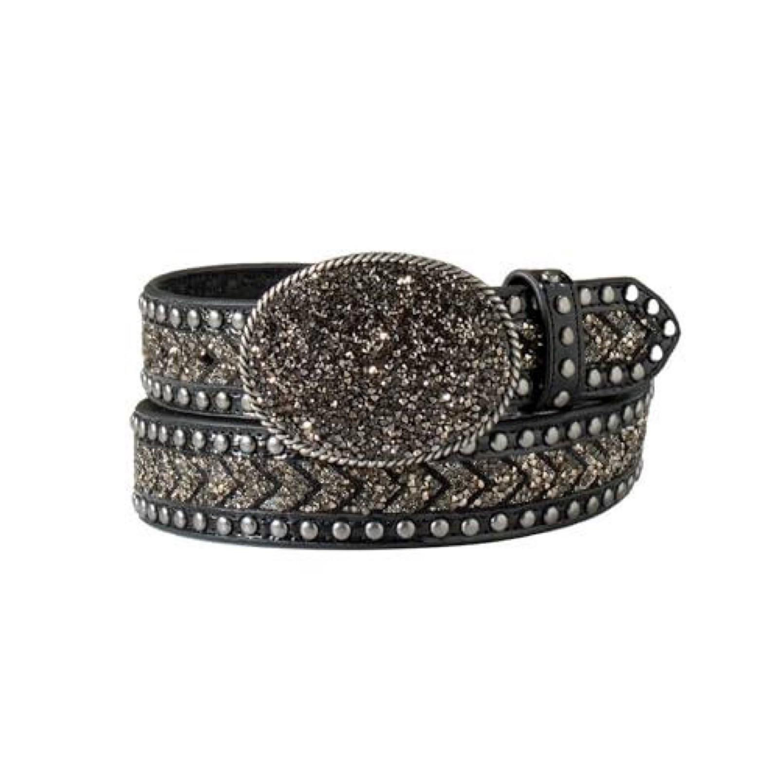 Add a bold touch of western sparkle with the Angel Ranch Crystal Chevrons Belt. This stylish women’s belt features a sleek black strap accented with small silver crystal chevrons down the center and gunmetal studs along the edges for eye-catching detail. The look is finished with an oval buckle featuring diamond and hematite resin inlay, giving it a distinctive western flair that pairs perfectly with jeans or riding attire.