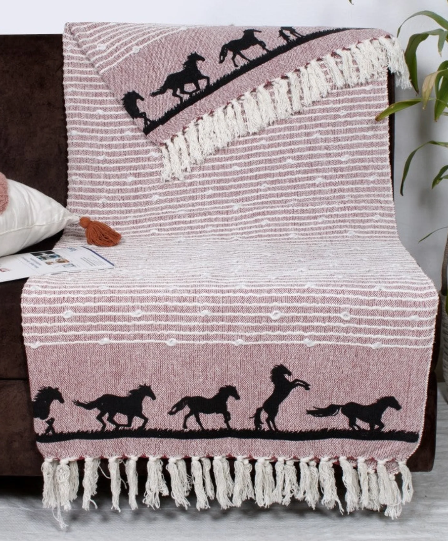 Exceptional quality, woven cotton throw with tassel fringe. Galloping Horses Design.