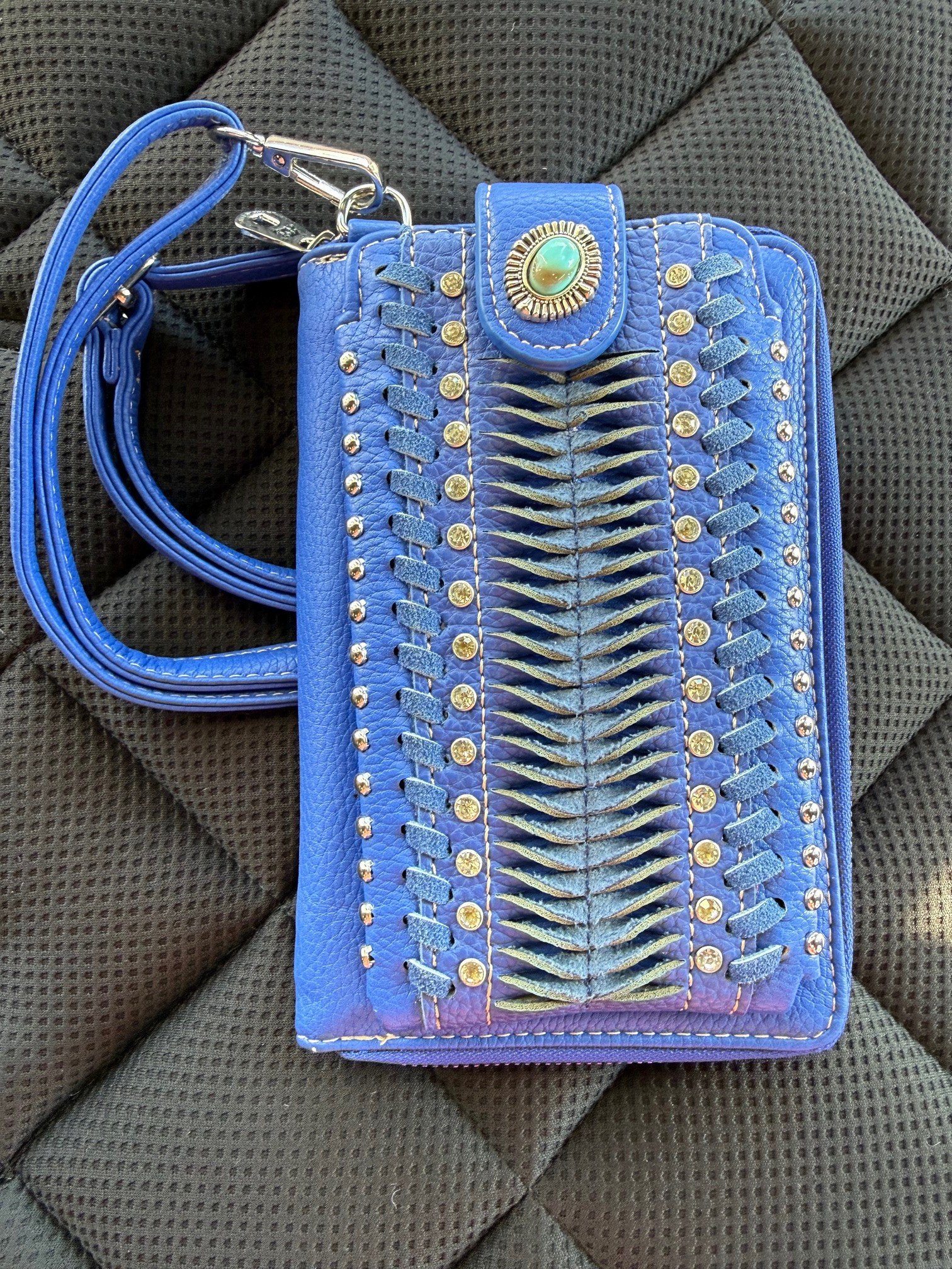 Western-style laced wallet and phone holder with gemstone accents for stylish everyday organization. 👜🤠
