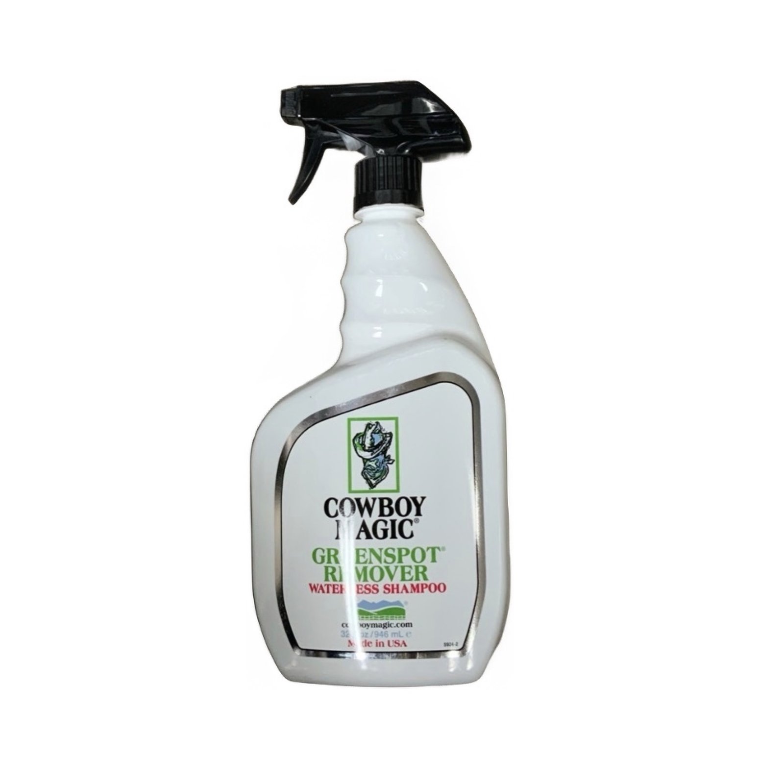 Keep your horse looking show-ready with Cowboy Magic Greenspot Remover, a convenient waterless shampoo designed to remove manure, urine, dirt, and sweat stains instantly. Simply spray it on the affected area, massage it in, and wipe clean with a damp towel—no rinsing required. The gentle formula helps cleanse and deodorize while conditioning the coat with ingredients such as witch hazel, honey, glycerin, silk, and panthenol, leaving hair soft and refreshed with a healthy shine. Ideal for quick touch-ups at the barn, shows, or during cold weather when bathing isn’t practical, this “shower in a bottle” is a staple grooming solution for horses and other animals.