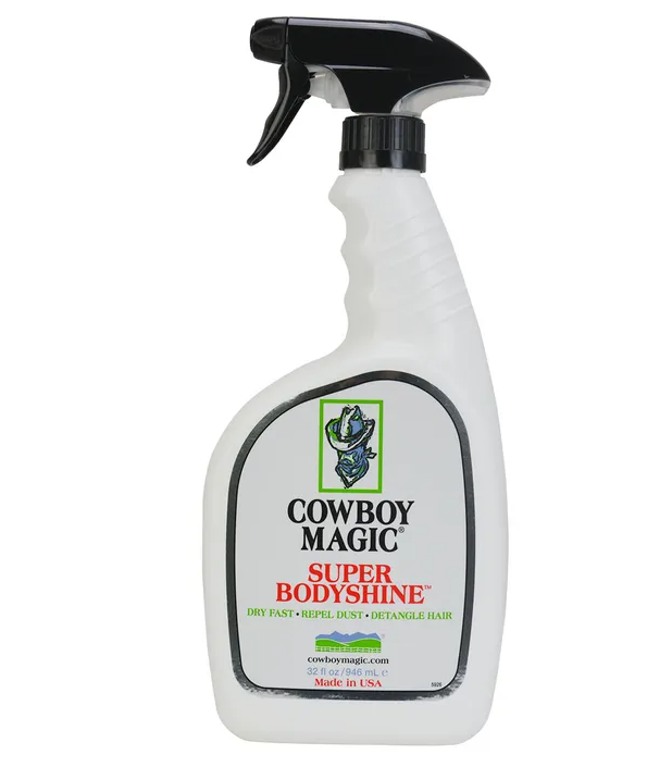 The ultimate finishing touch for your horse’s coat, Cowboy Magic Super Bodyshine delivers an instant, brilliant, long-lasting shine that highlights muscle definition and enhances color. This concentrated formula dries quickly and reflects a full spectrum of light, giving hair a polished, high-gloss finish without sticky residue or buildup. Enriched with Aloe Vera to condition and strengthen both hair and skin, it also helps repel dust — saving you time on grooming and keeping coats cleaner longer. Designed for use in both warm and cold weather, it’s allergy tested and dermatologist reviewed for gentle, versatile performance in the show-ring or for daily coat, mane and tail maintenance.