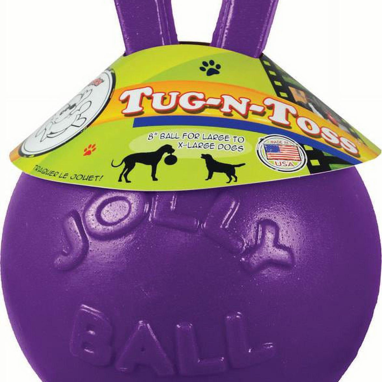 The Jolly Pets Tug-N-Toss is a durable, interactive dog toy designed for active play. Measuring 10 inches in diameter (X-Large), this heavy-duty ball is ideal for large breeds that love to chase, carry, and tug.