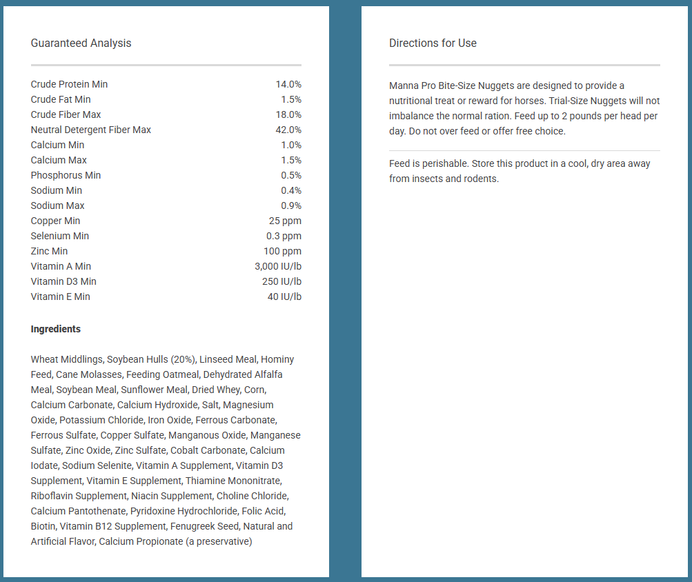 Treat your horse with Manna Pro Bite-Size Nuggets! Our Bite-Size Nuggets horse treats are designed to provide a nutritional treat or reward for your horse. Horses absolutely love these treats, and with added vitamins and minerals, you will love giving them! These tasty, pocket-sized treats are perfect for training, rewarding, stretching, and pampering your horse on all occasions.