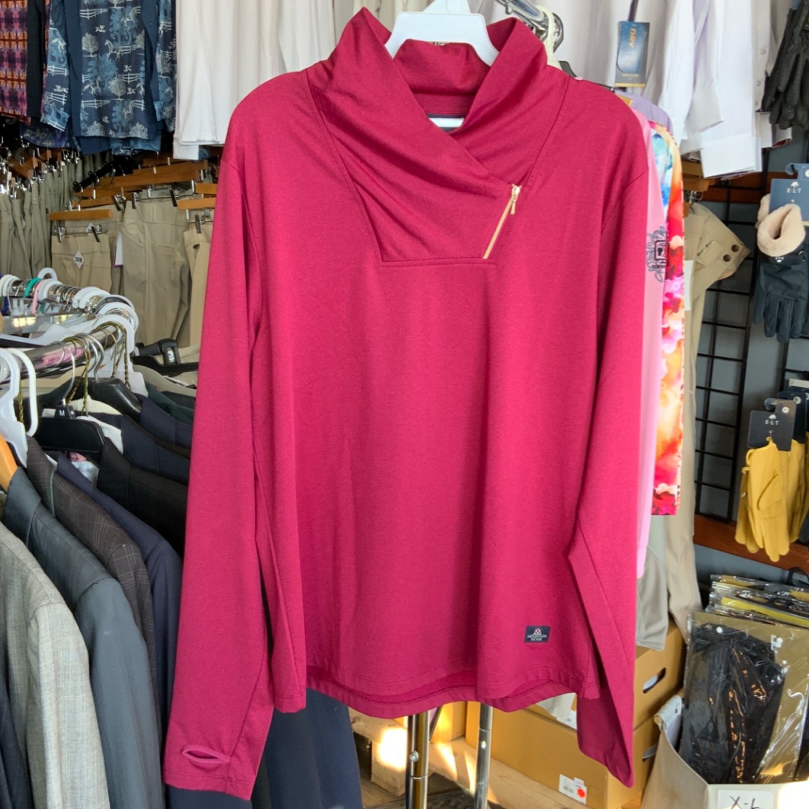 Functional, moisture wicking and super comfortable ladies long sleeve top with a high collar and small zip. 93% Polyester, 7% Elastane
