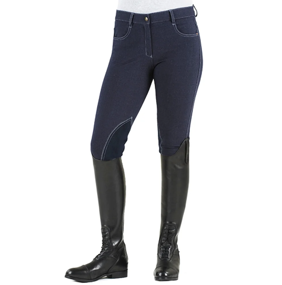 Ovation Euro Melange Knee Patch Breech Great fit, comfy, mid-weight cotton-spandex denim-knit. Front jean styling makes this cute Euro Seat breech perfect for casual riding wear. Features contrast stitching, suede logo patch and knee patches plus stretch ankle opening. Features: Mid-weight cotton spandex denim knit Front jean styling Euro seat Contrast stitching Suede logo patch Suede Knee Patches Stretch ankle opening Machine washable