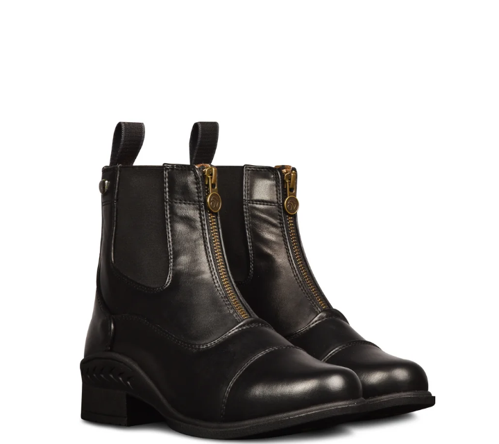 Classically styled, lightweight, and durable premium synthetic leather zip up paddock boots with perforated calfskin ankle and tongue with anti-bacterial and anti-fungal Cambrelle® wicking material to keep feet dry.