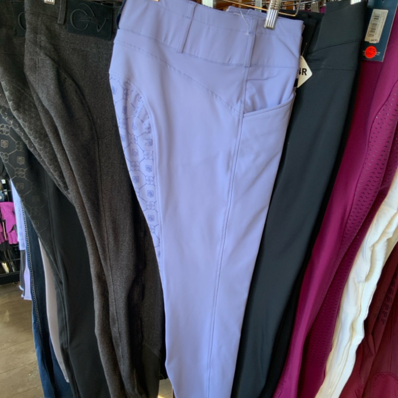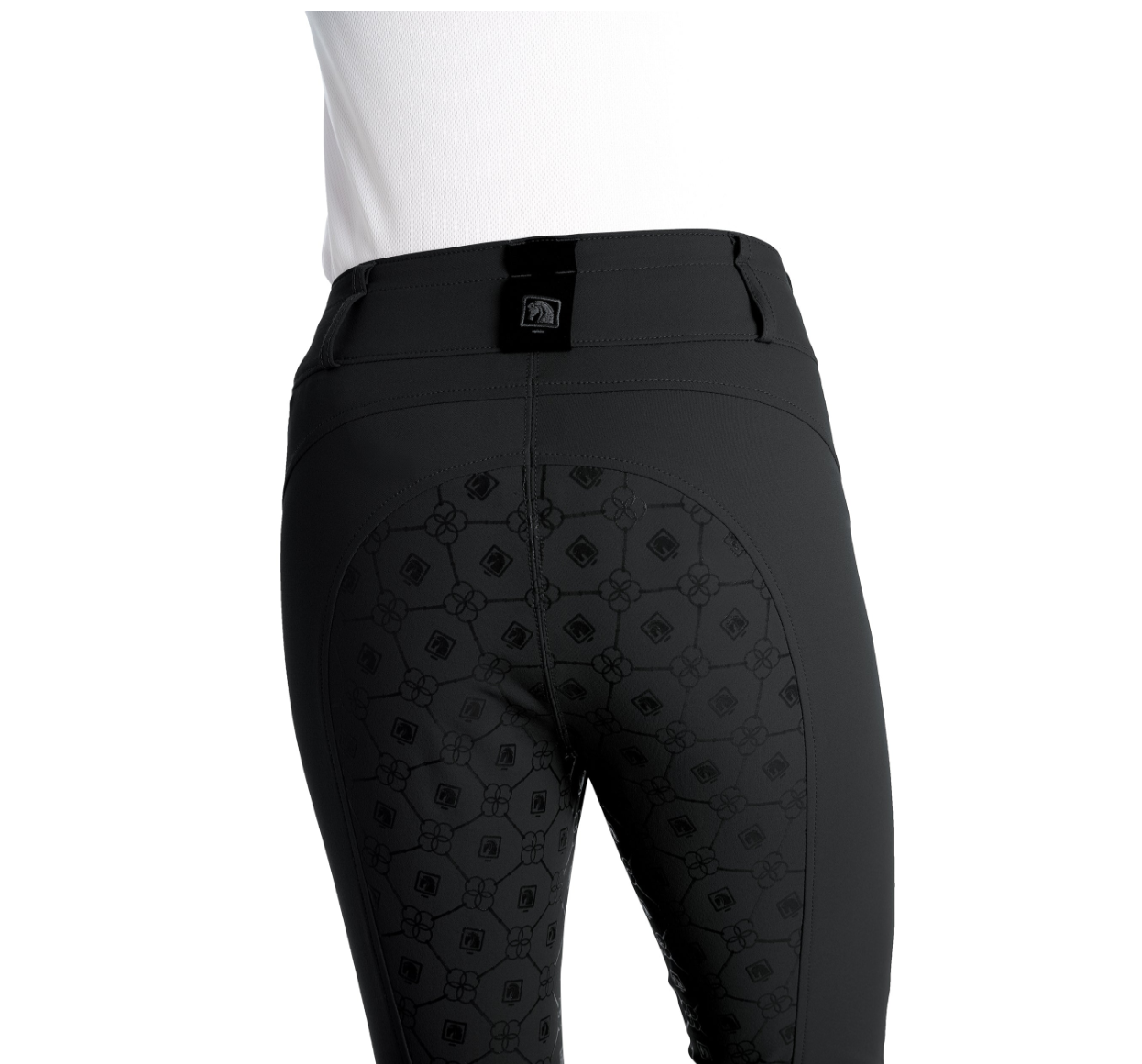 This ladies′ breech provides the high-waist fit desired by top-level riders. A silicone print on the seat provides a secure grip in the saddle without the added bulk of a full-seat layer.