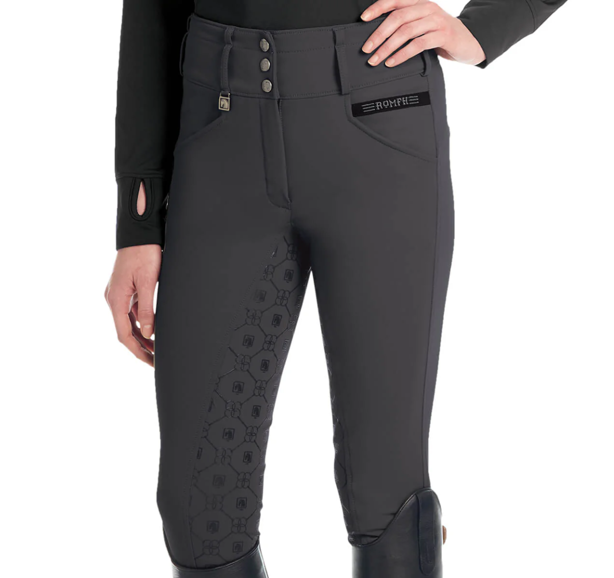 The Romfh® Isabella Silicone Full-Grip Breech is made of exclusive cooling Soft-Touch fabric in the same flattering, curvy cut as the super-popular Champion Full-Seat Breech. This “Curve Fit” is a special cut to reduce any gapping at the back waist; it is nipped in at the waist and cut fuller through the seat and thigh for a perfect fit on curvy girls.