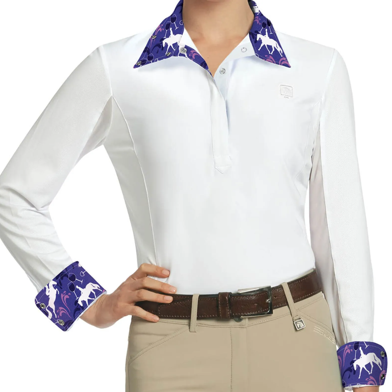 The Lindsay Show Shirt from Romfh has fun collar and cuff linings with unique flair. Women's hunter/jumper show shirt with a covered quarter snap placket makes it easy to get dressed quickly at the show. No snaps or buttons on the rest of the shirt means you never have to be concerned about gaps. The Lindsay Long Sleeve Show Shirt is a wonderful shirt for showing and is practical enough for schooling, too. Romfh riding clothes for women are designed to fit, flatter, and keep you comfortable so you can perform your best.