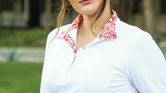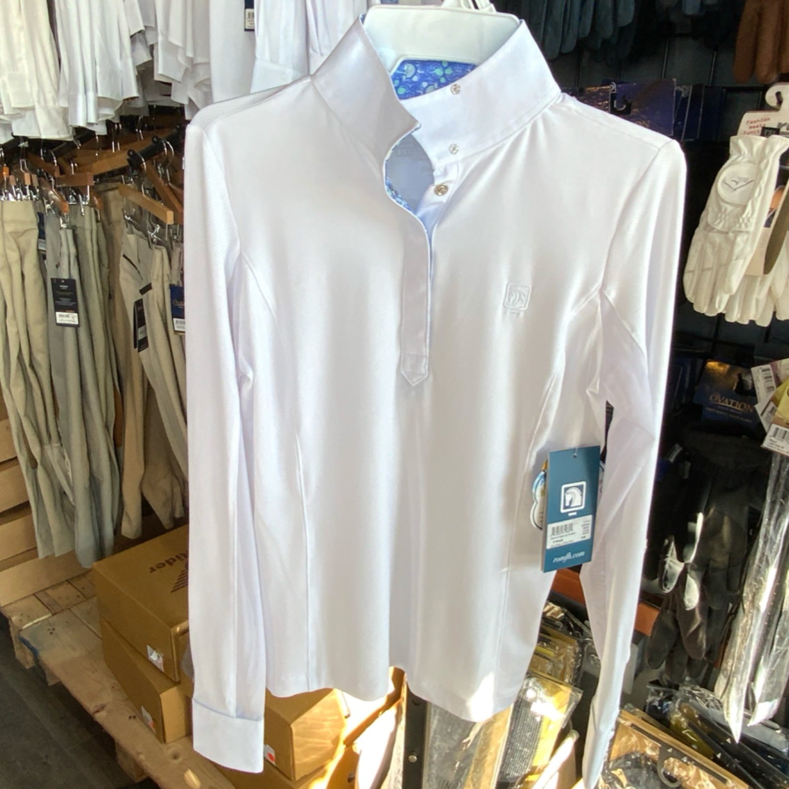 Romfh Lindsay Show Shirt s a women’s wrap collar English horse show shirt that offers cooling comfort for hot weather shows. The Lindsay is perfect for any level of showing with its crisp woven wrap collar and cuffs for professional polish. The stretch performance material with Chill Factor is smooth and silky and keeps you cool all day. The Lindsay also has Powerfresh fabric treatment that prevents odor-causing bacteria from forming.