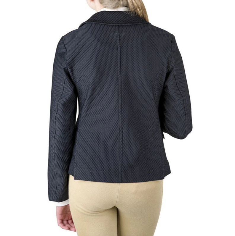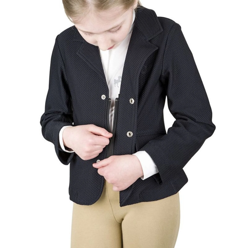 The TuffRider Children's EquiVent Show Coat is the answer to staying calm, cool and collected on show day. Lightweight mesh material allows for total airflow, while ensuring an opaque, traditional look. Waffle-like mesh wicks sweat from the skin to aid in moisture control. A hidden zipper with 4 snap buttons makes for effortless on/off. Princess stitching emulates a traditional, flawless look in the show ring. Achieving that traditional, sleek look doesn't mean sacrificing technical features or comfort!